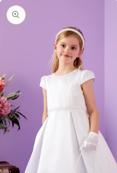 Harriet is an ankle length Holy Communion dress. This practically perfect Communion dress is simple yet classically elegant. The bodice has a pearl decorated neckline, gathered cap sleeves and a pearl embellished waistband. A flared duchess satin skirt completes the classic look. To finish the pre tied bow at the back means it looks perfect all of the time.