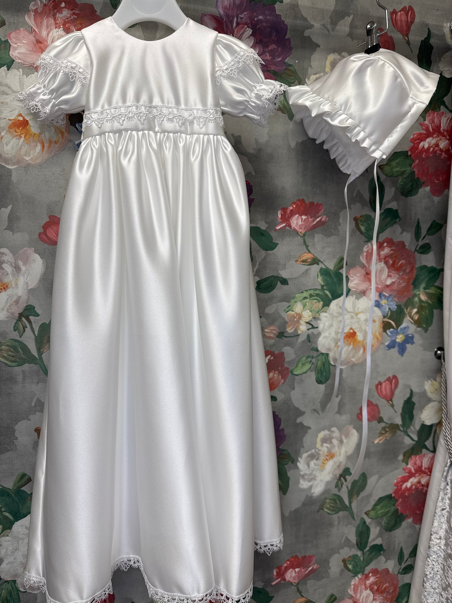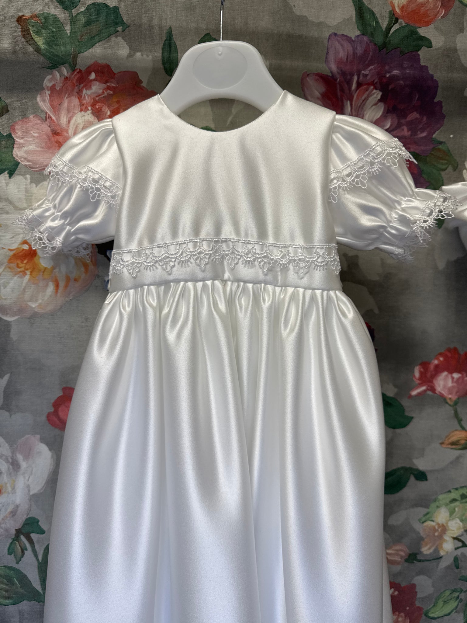 I’m delighted to say I have designed the most beautiful white duchess satin gown suitable for baby boy or baby girl.