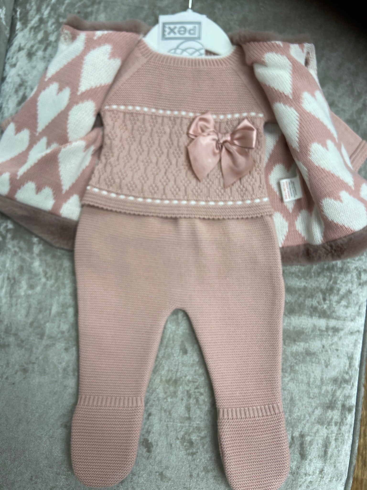 PEX baby girl 3 piece dusky pink knitted set with fur gilet. - Chloe.